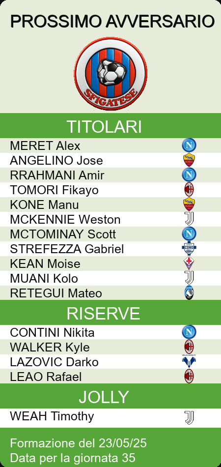 HOME LEGA esauritim MEDIE VOTI PROBABILI GAZZETTA PROBABILI FANTACALCIO PROBABILI CORRIERE